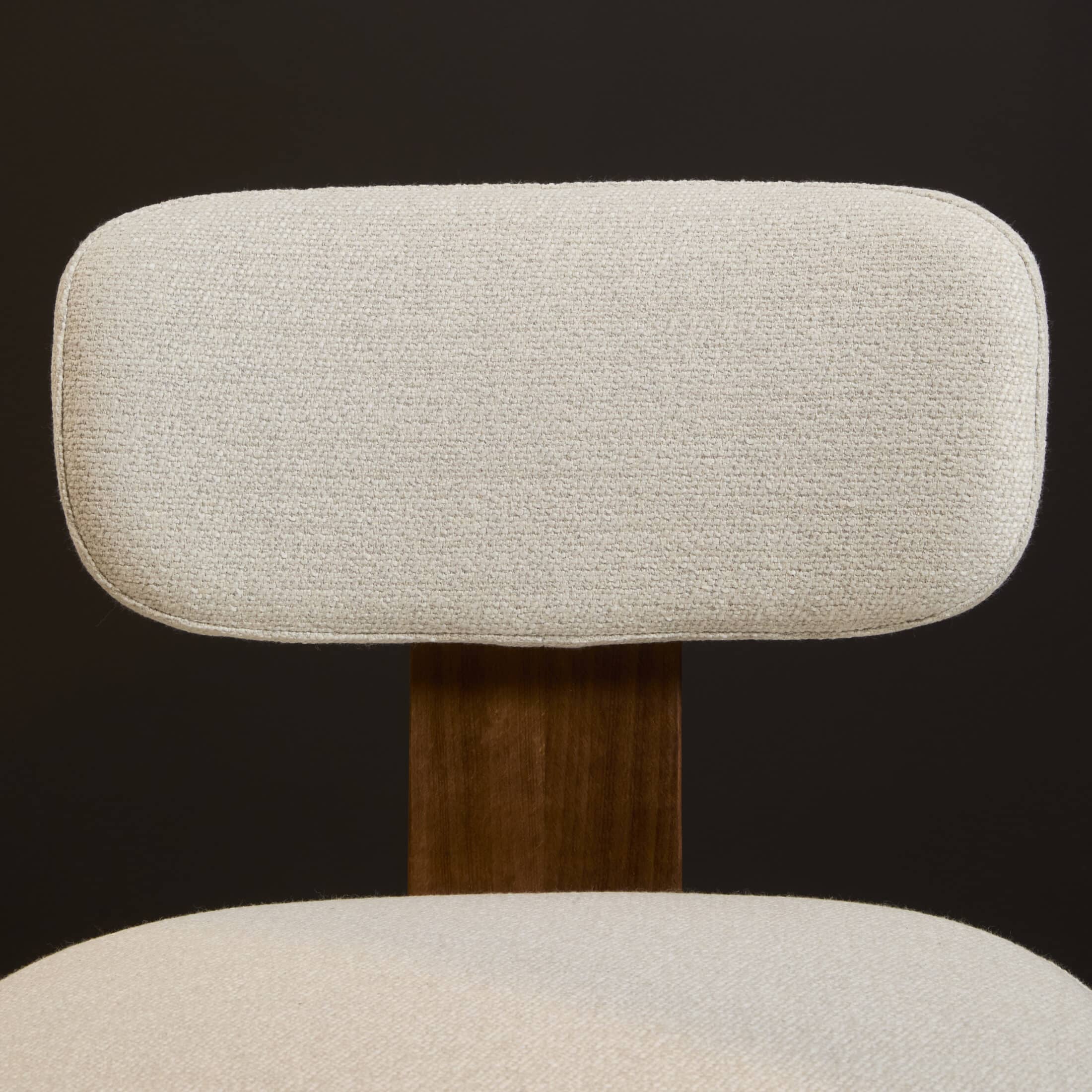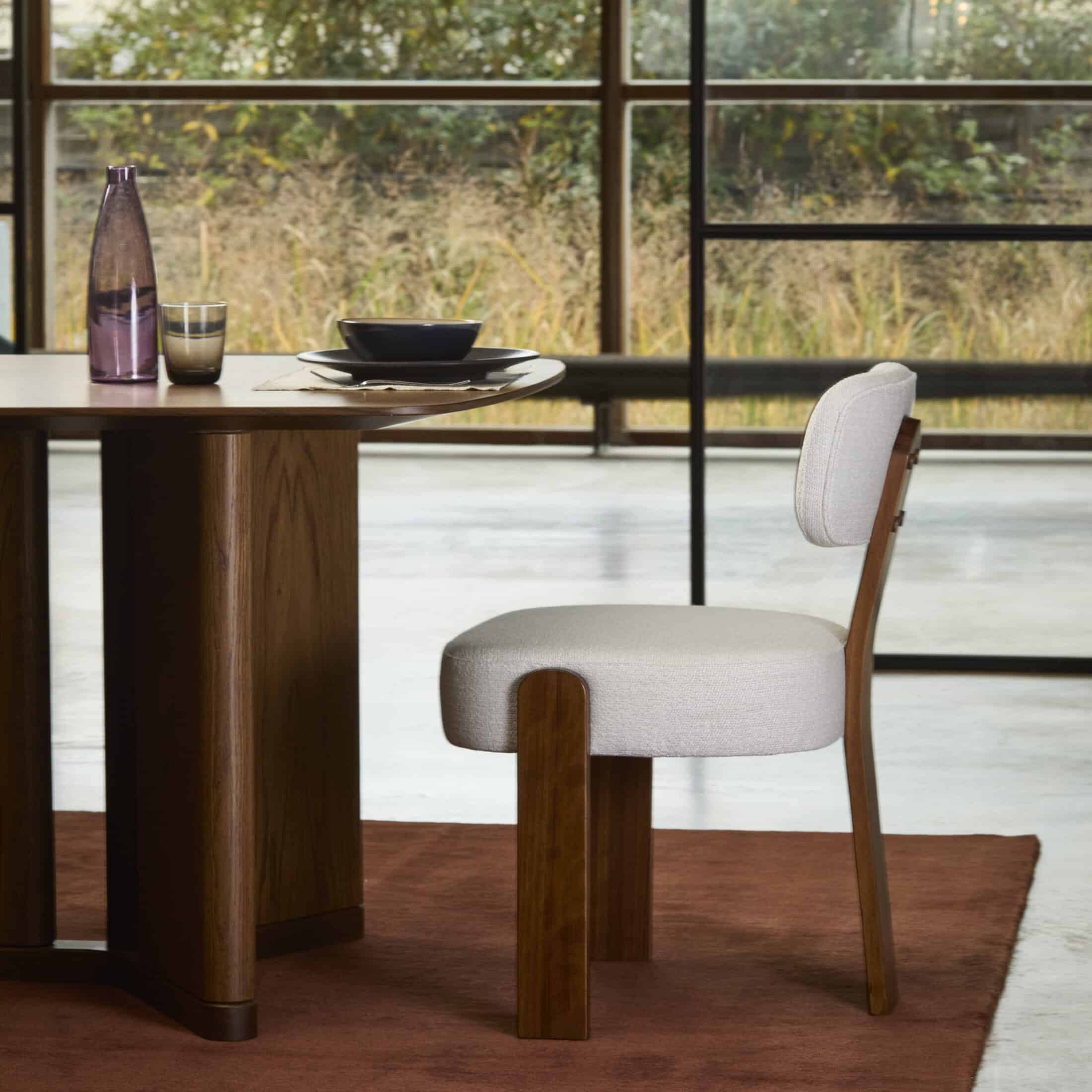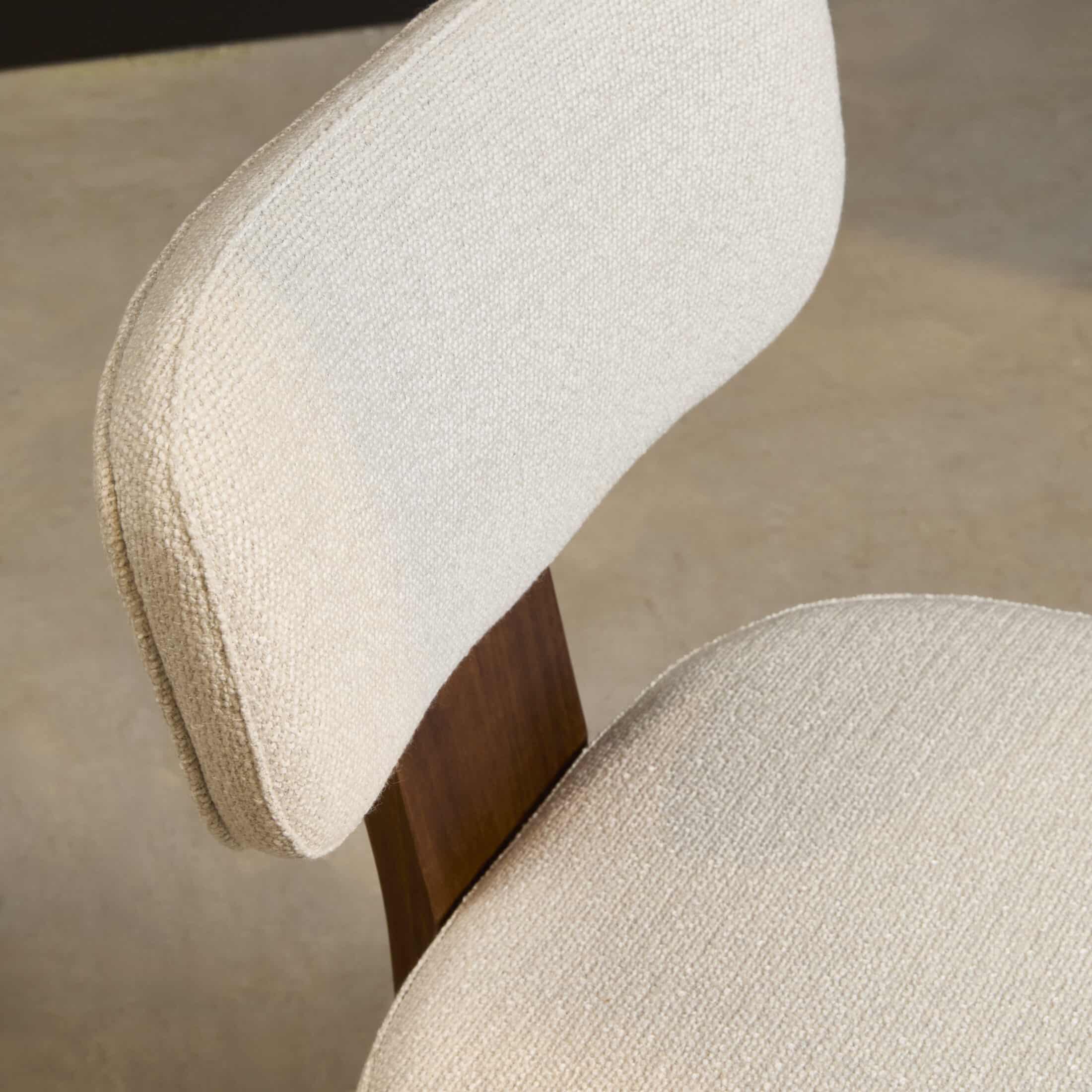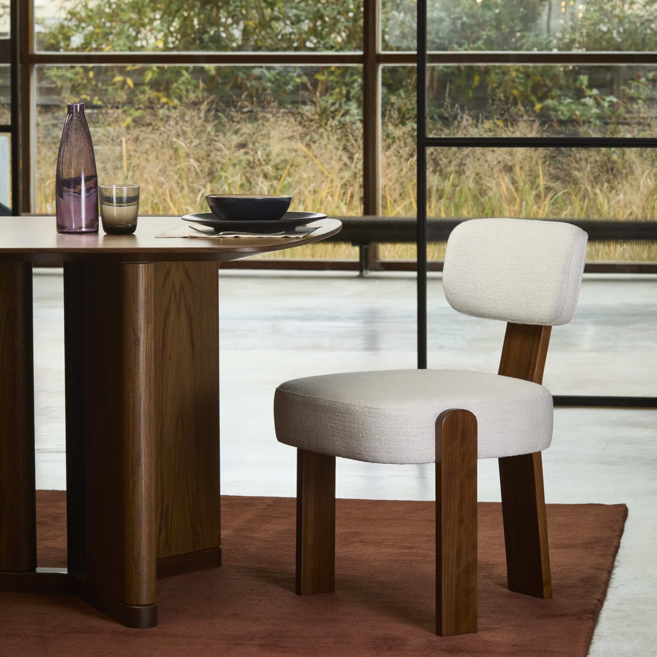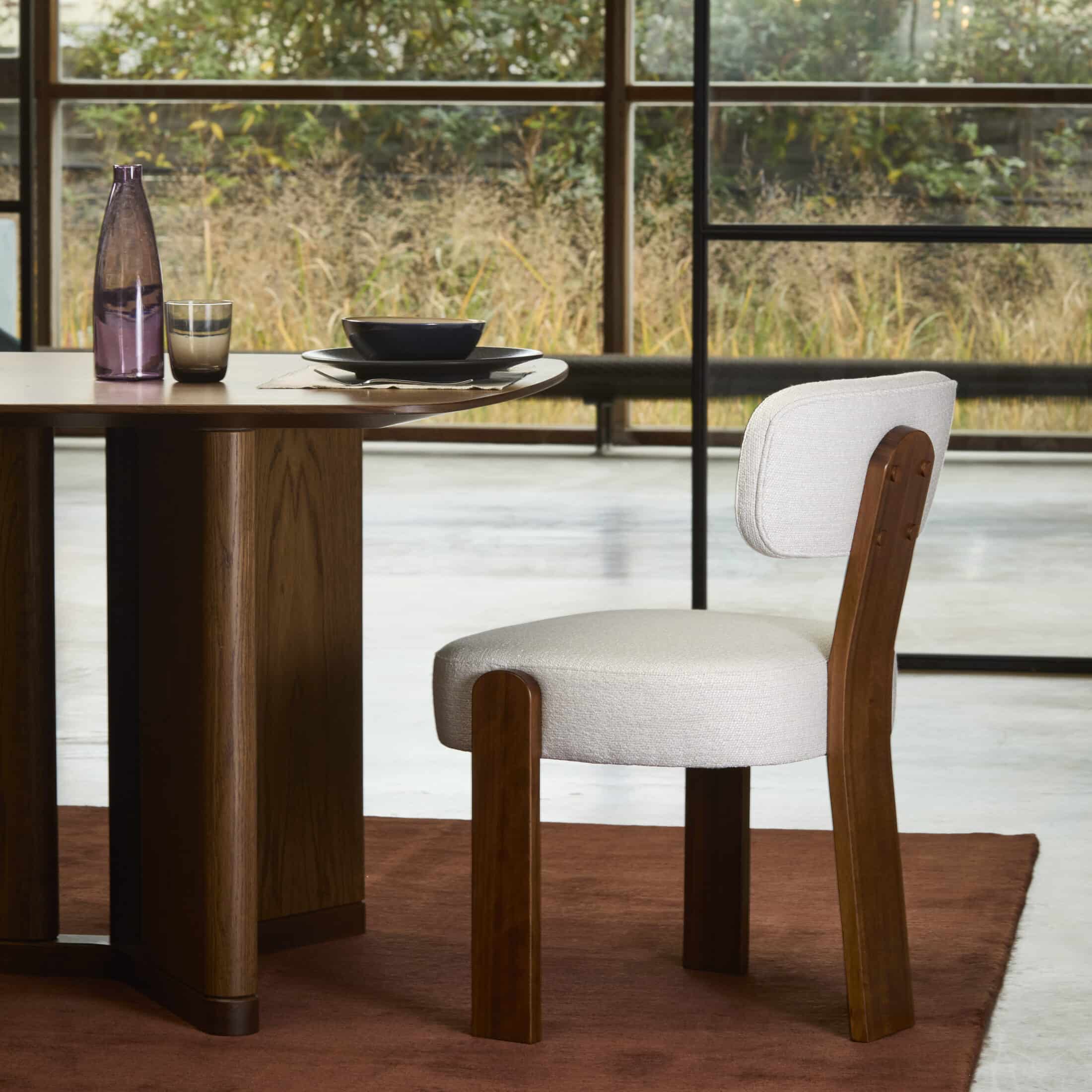 This chair combines a sculptural wooden frame with a softly upholstered seat and backrest, creating a refined balance between structure and comfort. Built with a Scandinavian hard pine frame using mortise and tenon construction and solid beech wood legs, it features stretch belts in the seat for lasting support. The fixed seat and back are made of high-resilience (HR) foam, offering both durability and exceptional comfort, while the warm wood tones and clean lines give it a contemporary yet timeless appeal, ideal for both dining and lounge settings.