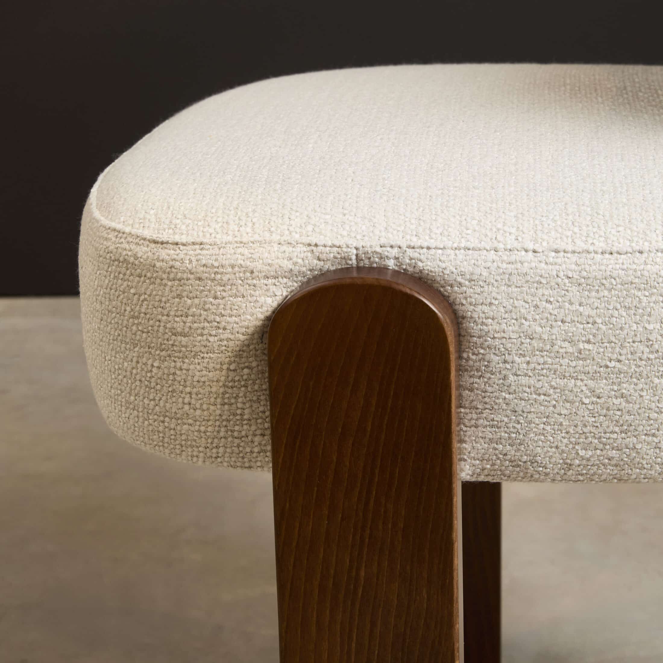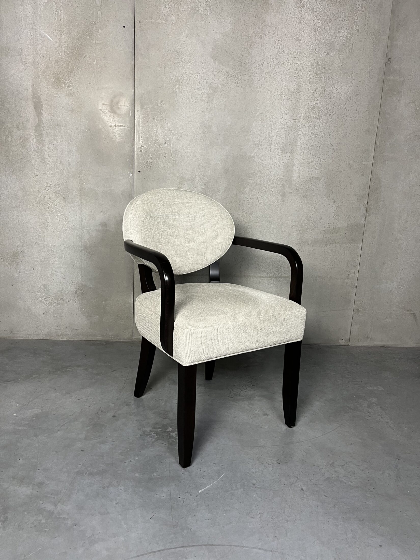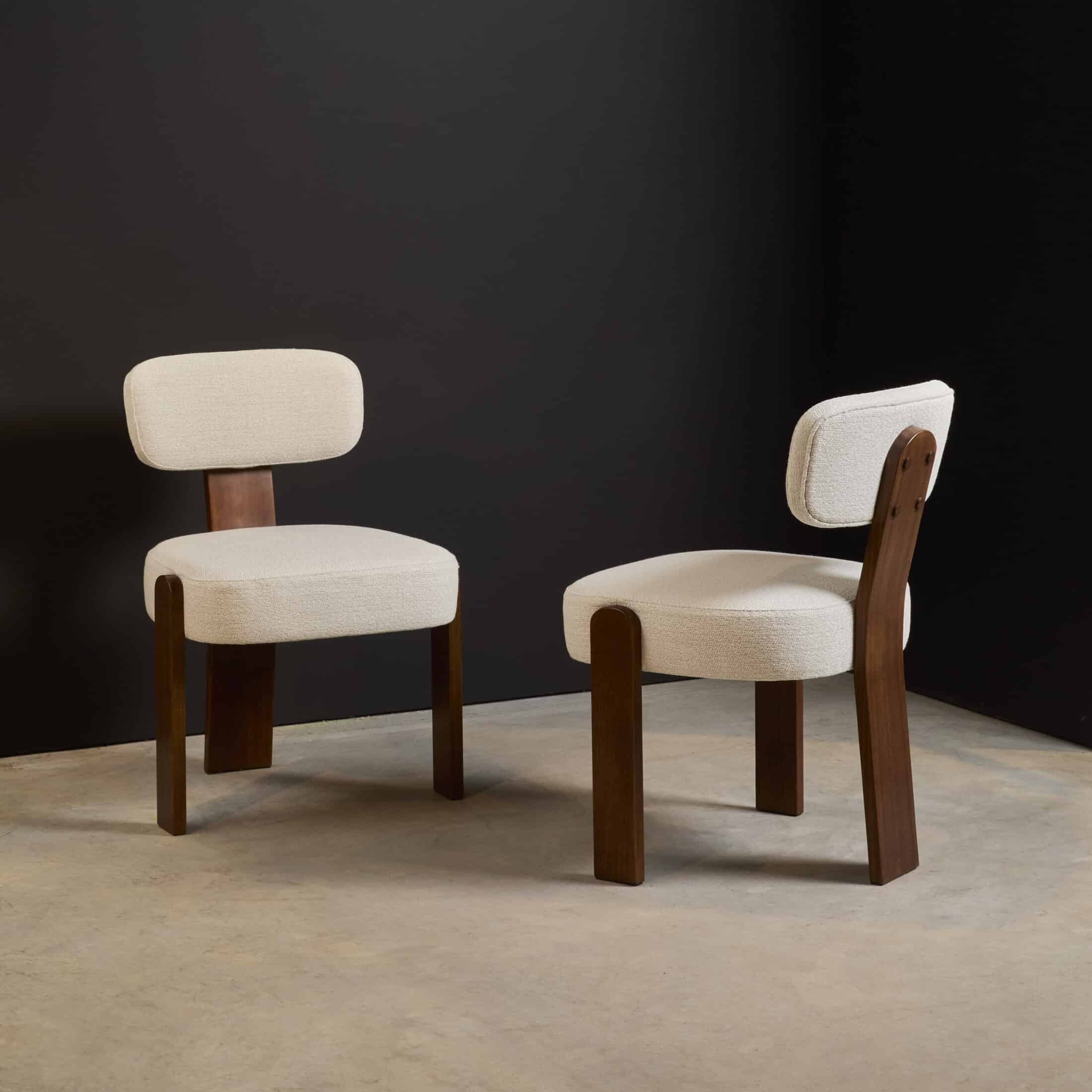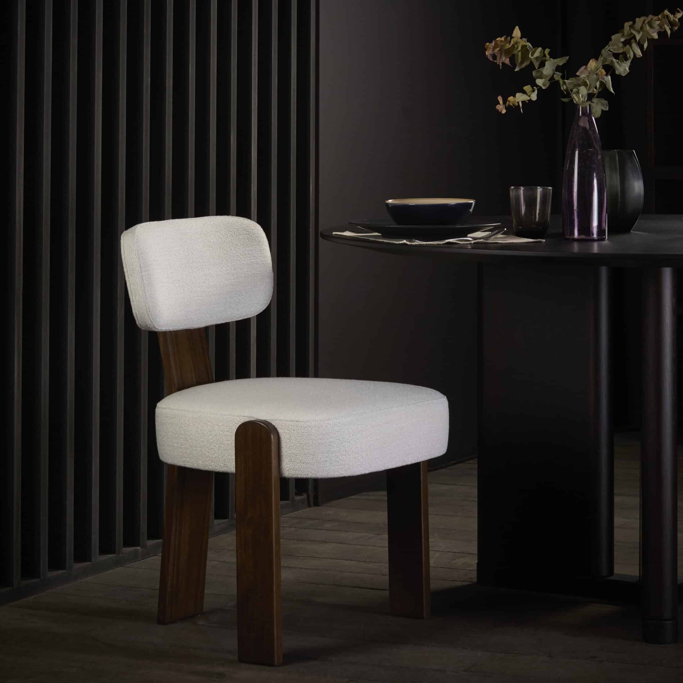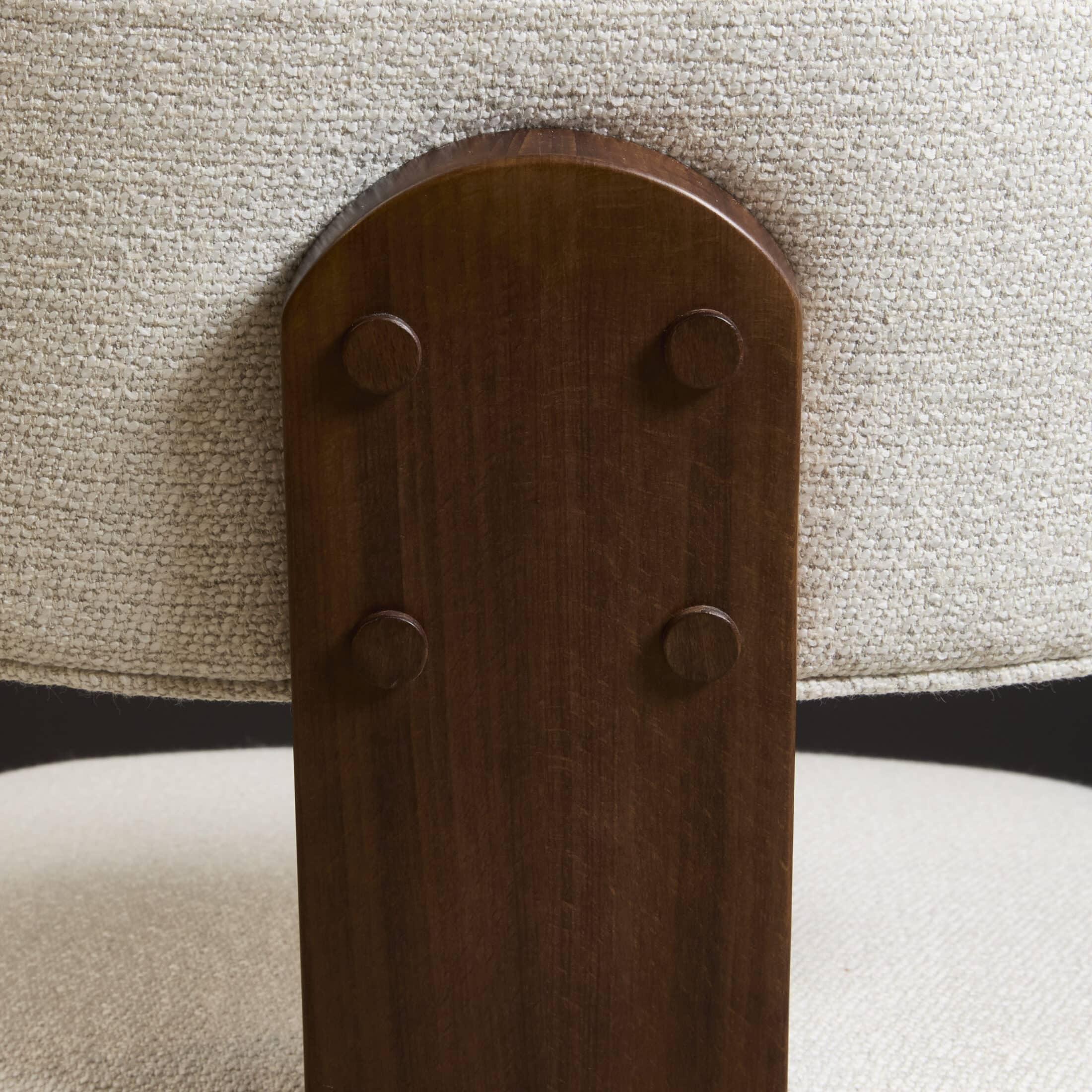 This chair combines a sculptural wooden frame with a softly upholstered seat and backrest, creating a refined balance between structure and comfort. Built with a Scandinavian hard pine frame using mortise and tenon construction and solid beech wood legs, it features stretch belts in the seat for lasting support. The fixed seat and back are made of high-resilience (HR) foam, offering both durability and exceptional comfort, while the warm wood tones and clean lines give it a contemporary yet timeless appeal, ideal for both dining and lounge settings.