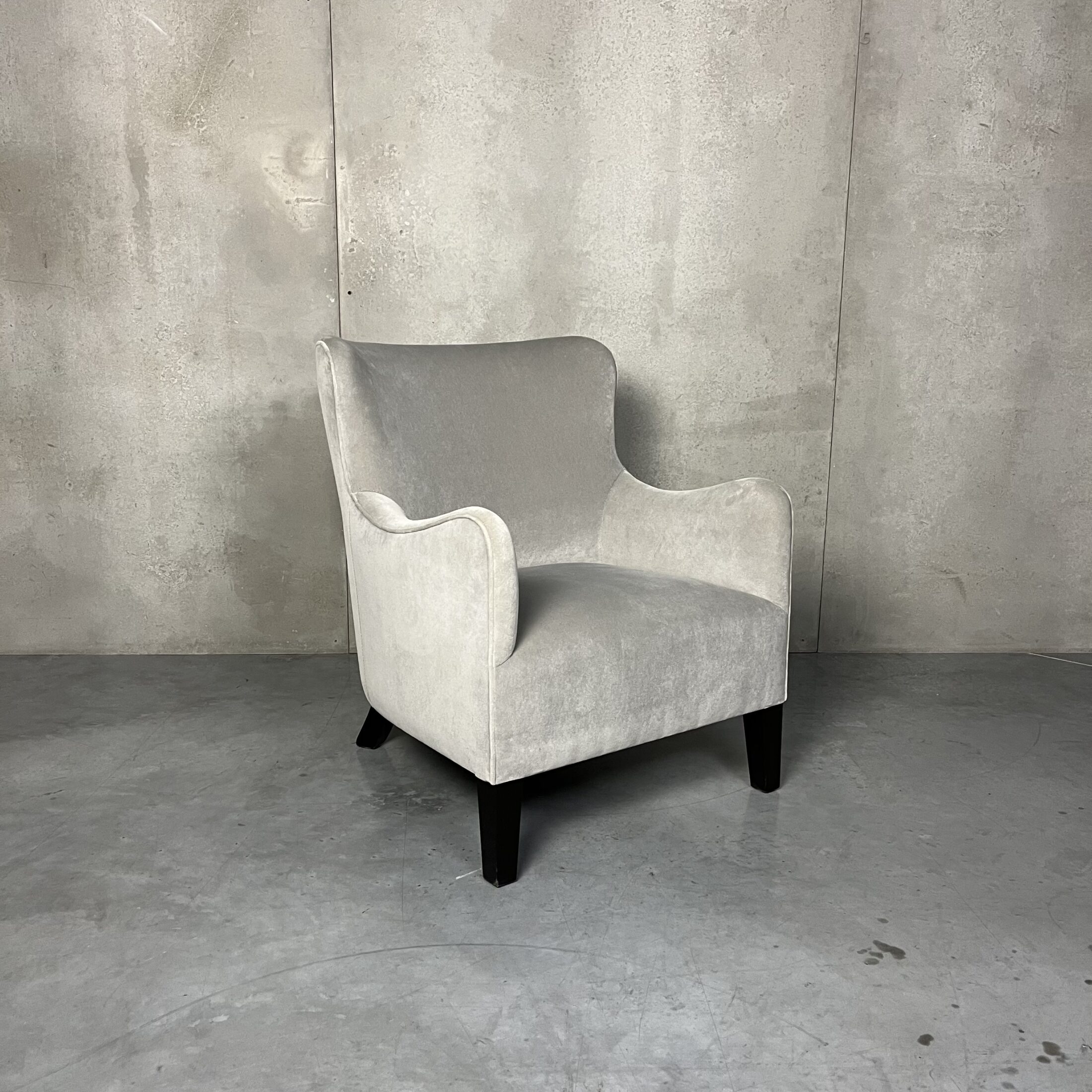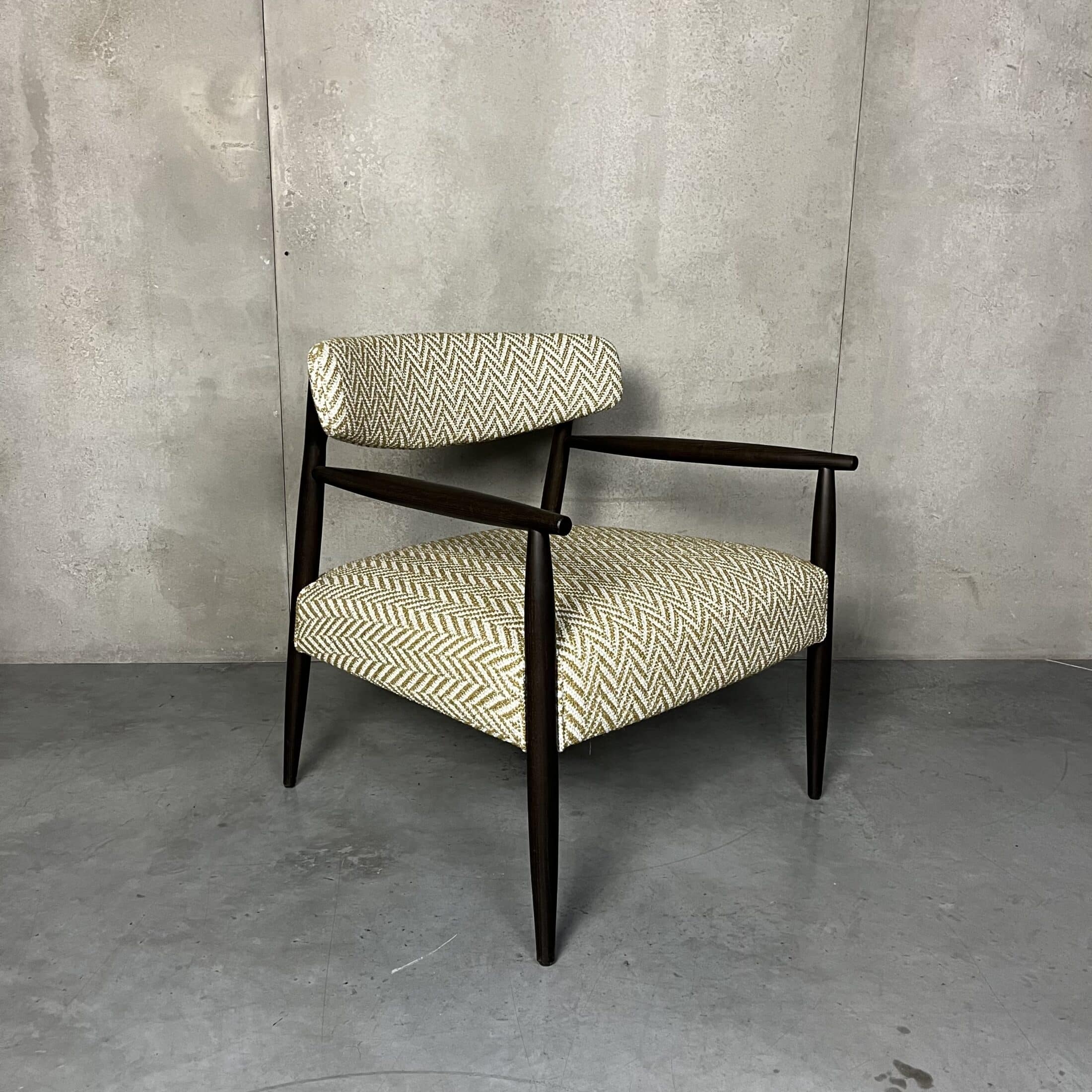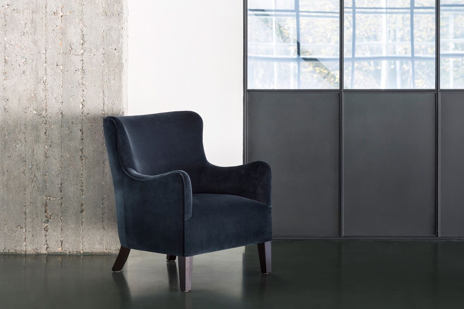 Structure en frêne massif assemblé par tenons et mortaises. Suspension sangles élastiques entrecroisées. Assise fixe mousse HR 40 kg/m³ sous ouate polyester. Dos garni Mousse 30 kg/m³. Garnissage fixe.