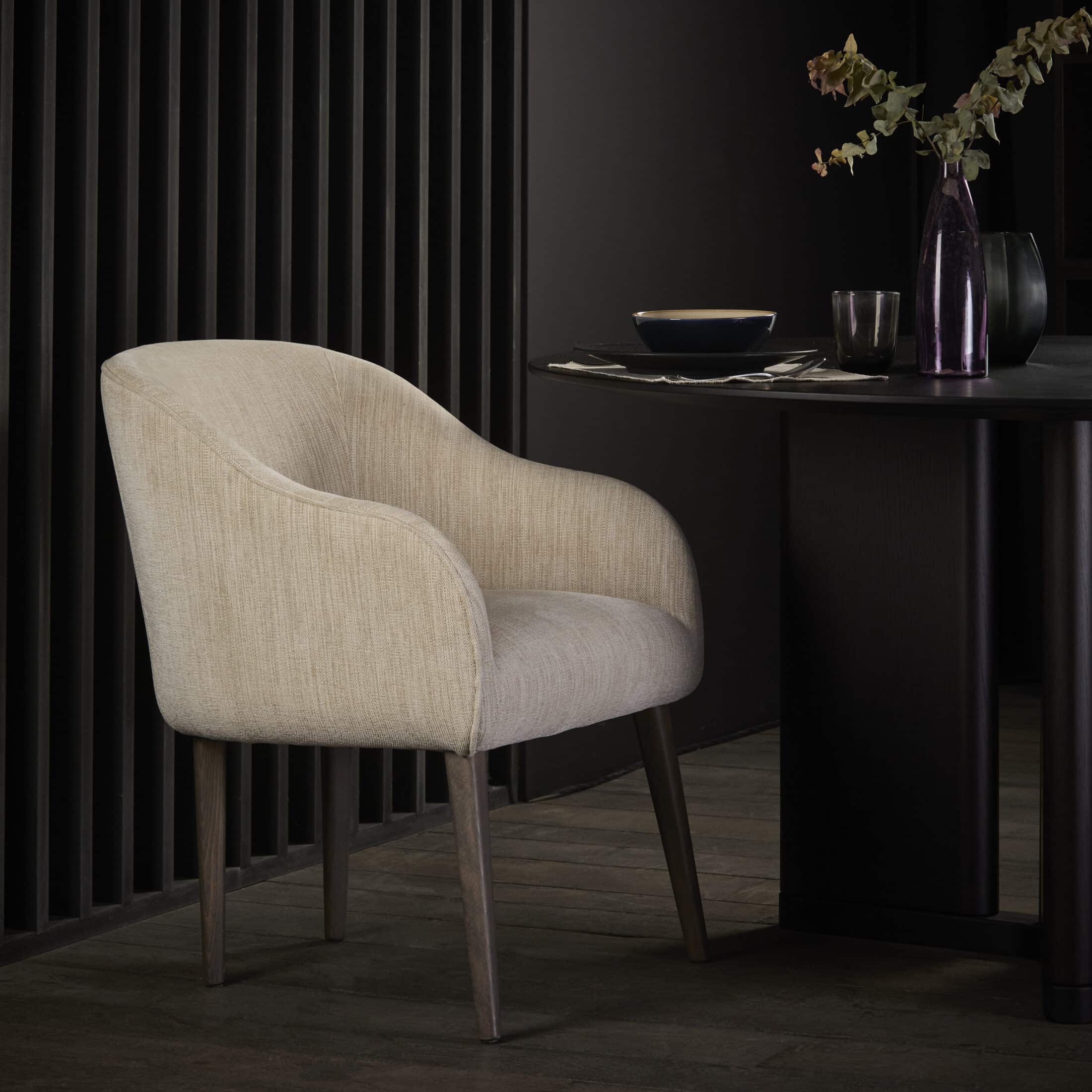 Massief beuken en grenen frame in elkaar gezet met pen en gat verbindingen. Ophanging met gekruiste elastische banden. Zitting gevuld met 35 kg/m³ schuim. Rug gevuld met 25 kg/m³ schuim. Vaste Bekleding.