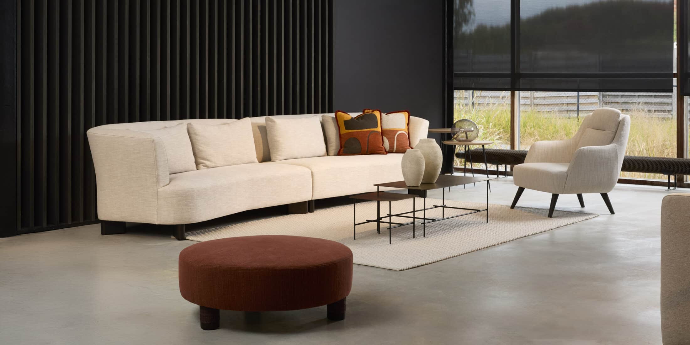 De Charleston-sofa heeft een elegante, zacht gebogen vorm met soepele, asymmetrische lijnen die zich op een organische manier ontvouwen. Het resultaat is een sculpturale en tegelijk uitnodigende uitstraling, perfect geschikt voor eigentijdse interieurs.